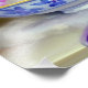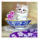 Impression photo avec un chaton blanc moelleux ! Le chaton aux yeux bleus est assis dans un bol bleu avec des fleurs roses. Une couverture à fleurs violettes est drapée devant. Un cadeau merveilleux pour les amoureux de les chats et les amateurs d'art victorien !