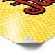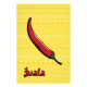 Un piment de jwala rouge, également connu sous le nom de poivre chaud indien, est décoré de motifs inspirés des médailles indiennes et est assis sur un arrière - plan jaune avec une version plus petite du même motif et un étiquette de script dans le coin. Ce poivre modérément épicé sert à réchauffer des curries authentiques et d'autres plats indiens.