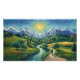 This vibrant, textured painting depicts a serene valley with a winding river and lush fields leading towards distant snow-capped mountains, all under a bright, swirling sun.