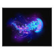 Grande méduse bleue, artistiquement dessinée, brillante, brillante, avec de longues tentacules sur arrière - plan noir avec bioluminescence violette. Méduse brillante.