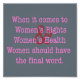 Dans le texte rose il est écrit : "Quand il s'agit des droits des femmes et de la santé des femmes, les femmes devraient avoir le dernier mot." Le signe "et" est une couleur rouge, est placé dans l'arrière - plan du texte rose, et est agrandi pour couvrir à la fois les "droits" et la "santé" du texte rose.