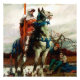 Un chevalier en armure monté sur un cheval se tient à côté d'une rivière, tenant une lance à l'expression réfléchie. A proximité, deux individus s'assoient sur le sol, regardant le chevalier avec des expressions d'inquiétude ou de peur. Cette peinture s'appelle "The Coming Lancaster" de Howard Pyle.