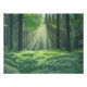 La lumière du soleil filtre à travers de grands arbres denses, projetant une lueur éclatante sur un sol forestier verdoyant parsemé de fines fleurs blanches. Le cadre serein évoque le calme et la tranquillité.