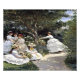 "Women in the Garden" transporte les spectateurs sur une scène de jardin ensoleillée où les figurines occupent élégamment un espace luxuriant et verdoyant. Cette oeuvre est un chef-d'oeuvre de l'impressionnisme, qui présente une exploration de lumière, de couleur et des effets éphémères de l'ambiance naturelle. La toile est remplie des couleurs vives des fleurs fleuries et du feuillage verdoyant, qui servent de toile de fond à plusieurs femmes habillées en tenue tendance de l'époque. Chaque personnage est représenté avec grâce et fluidité, capturé dans des moments de repos ou de loisirs au milieu du cadre paisible du jardin. Les coups de pinceau sont vivants et spontanés, véhiculant un sens du mouvement et de l'immédiateté qui caractérise le style impressionniste. Le jeu de la lumière du soleil filtrant à travers les feuilles crée des motifs applaudis de lumière et d'ombre sur le sol et les vêtements, améliorant le sens de la profondeur et de l'atmosphère dans la composition. Les couleurs sont lumineuses et harmonieuses, avec des contrastes de lumière et de foncé contribuant à la qualité dynamique globale de la scène. Le jardin lui-même est représenté avec un détail minutieux, suggérant un espace soigneusement cultivé qui mélange beauté naturelle et présence humaine. Les arbres, les arbustes et les fleurs sont restitués avec une touche de peinture, capturant l'essence d'un jardin fleuri dans toute sa splendeur. "Les femmes dans le jardin" n'est pas seulement une représentation d'une activité de plein air tranquille, mais aussi un témoignage de la capacité à saisir l'essence d'un moment éphémère dans le temps. Il invitation les spectateurs à s'immerger dans la beauté tranquille de la nature et à apprécier la coexistence harmonieuse des figures humaines et du monde naturel.