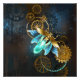Luciole à vapeur avec ailes bleues transparentes et ampoule verte sur arrière - plan usé, marron, texturé. Style Steampunk.