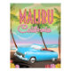 Malibu California affiche de voyage d'époque d'une vieille voiture classique au bord d'une belle plage.
