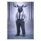 A composed anthropomorphic moose dressed in a classic shirt, tie and suspenders, standing within a misty forest setting. The cool monochrome palette and minimalist styling create a calm yet powerful statement piece for modern interiors.