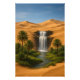 Une œuvre d'art captivante représentant une cascade émergeant entre des dunes de sable doré, entourée de palmiers luxuriants et d'une oasis verte vibrante. Le tableau reflète le contraste de la nature entre le désert aride et la verdure florissante, créant une scène sereine qui transporte le spectateur dans un monde de tranquillité et de calme, où le sable et l'eau se rencontrent dans une harmonie visuelle saisissante.