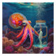 "Ocean’s Silent Captive" - Portrait de pieuvre coloré. Dans un monde océanique surréaliste, une pieuvre géante regarde un homme seul piégé dans un bocal de verre. Cette scène évocatrice explore les thèmes de l'enfermement, de l'immensité de la nature et de la fragile barrière entre liberté et captivité. Les couleurs vives et les détails complexes invitation une profonde réflexion sur la vulnérabilité humaine sous les vagues.