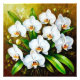 Une œuvre d'art détaillée d'orchidées blanches vibrantes complétées par un feuillage vert luxuriant, affichée sur un fond brun doré texturé, mettant en valeur l'élégance et la beauté des arrangements floraux.