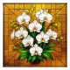 Orchidées blanches élégantes, dans un décor de vitrail lumineux, présentant des feuilles verts vibrants sur un décor doré saisissant, invoquant beauté et raffinement.
