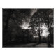 Une photo chaude tonique en noir et blanc prise au milieu des arbres à Bute Park Cardiff lors d'un après-midi ensoleillé de novembre, le soleil d'automne bas dans le ciel brille à travers les arbres jetant de longues ombres et des silhouettes spectaculaires.