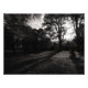 Une photo chaude tonique en noir et blanc prise au milieu des arbres à Bute Park Cardiff lors d'un après-midi ensoleillé de novembre, le soleil d'automne bas dans le ciel brille à travers les arbres jetant de longues ombres et des silhouettes spectaculaires.