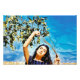 Une représentation artistique éclatante d'une femme tenant des branches d'arbres sous le ciel bleu vif.