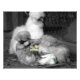Cette photo a été numériquement modifiée, rendant l'arrière - plan noir et blanc, mais laissant les trois poussins en couleur. La photo est celle de deux poules de poulet soyeux, l'une bouffant l'autre blanche tandis qu'elles s'allongent en regardant leur famille de poussins jaunes nouvellement éclos. Désireux de voir le monde, deux bébés regardent au-dessus de l'aile de la mère brune, un autre poussin sort derrière la jambe de la mère. Une scène adorable. La Silkie (parfois orthographiée en alternance Silky) est une race de poulet nommée pour son plumage atypique et moelleux, qui se dit comme de la soie. La race possède plusieurs autres qualités inhabituelles, comme la peau et les os noirs, les lobes d'oreilles bleus et cinq orteils par pied, alors que la plupart des poulets n'en ont que quatre. Ils sont souvent exposés dans des salons de volaille et apparaissent en différentes couleurs. En plus de leurs caractéristiques physiques distinctives, les Silkies sont bien connus pour leur tempérament calme et amical. Parmi les volailles les plus dociles, les Silkies sont considérés comme un animal de compagnie idéal. Les poules sont aussi exceptionnellement de la chair, et font de bonnes mères. Bien qu'ils soient des couches régulières, pondant environ trois oeufs par semaine, ils sont couramment utilisés pour écloser des oeufs d'autres races et espèces d'oiseaux.