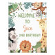 Boys Modern Green Brown Wild Safari Anniversaire Affiche de bienvenue mignonne garçons safari ou d'anniversaire à thème sauvage accueille affiche avec six animaux de la jungle et la verdure.