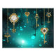 Or, clés antiques avec engrenages et cadrans accrochés sur chaînes dorées sur arrière - plan vert lumineux.