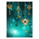 Or, clés antiques avec engrenages et cadrans accrochés sur chaînes dorées sur arrière - plan vert lumineux.