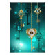 Or, clés antiques avec engrenages et cadrans accrochés sur chaînes dorées sur arrière - plan vert lumineux.