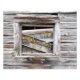 Les restes d'un vieux panneau dans la fenêtre d'une grange délabrée.