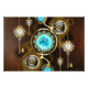 Turquoise lenses with antique watch with brass gears and golden keys on rusty, brown background. Steampunk style.