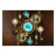 Turquoise lenses with antique watch with brass gears and golden keys on rusty, brown background. Steampunk style.