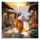 A woman in a flowing orange and blue dress walks down a charming street lined with quaint shops and vibrant flowers. The warm glow of the setting sun casts a soft light on her elegant silhouette, creating a picturesque scene that captures the essence of a leisurely stroll through a picturesque town.