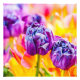 Violet coloré, violet, tulipes roses sur un lit à fleurs. Presque toutes les couleurs arc-en-ciel présentes. Scène florale lumineuse et positive. Photographie macro.