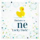 Le thème de la fête du premier anniversaire "One Lucky Duck" est composé de canard en caoutchouc entouré de confettis, de bulles et de texte bleu.