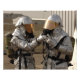 Un pompier irakien vérifie deux fois l'équipement de protection individuelle de son partenaire équipé d'équipement.