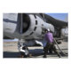 Un technicien en carburant d'aviation fixe une conduite de carburant à un Harrier AV-8B.