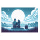 A couple gazes at the horizon under the immense light of the moon, while the city rests in the distance.