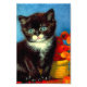Photo Imprimée avec un beau chat en smoking Van Gogh ! Ce petit chaton pose à côté d'un panier de fleurs orange sur une table rouge. Un grand cadeau pour les amoureux de les chats et les collectionneurs d'art hollandais !