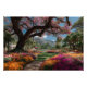 An ancient tree heavy with brilliant magenta-pink blossoms arches over a lush, sunlit garden paradise. Symmetrical beds overflow with intense orange, yellow, purple, hot pink, and white flowers framing a winding stone path that leads to a tranquil pond reflecting distant palms and rugged mountains. White colonial buildings nestle among tropical greenery under a perfect blue sky, creating an atmosphere of pure joy, abundance, tranquility, and timeless natural beauty. Perfect for living rooms, sunrooms, bedrooms, home offices, meditation spaces, bathrooms, or as uplifting gifts for gardeners, nature lovers, wellness seekers, or anyone who finds peace and happiness in vibrant, flourishing landscapes.