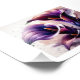 Three elegant calla lilies are rendered in rich shades of purple and pink, with intricate details and fluid lines. The background is filled with soft splashes of complementary colors.