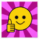 Visage jaune amusant et heureux avec un pouce levé. Il a des points noirs pour les yeux et un fond de soleil rayonnant rose clair et foncé espiègle.