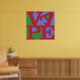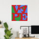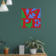 Le mot VAPE en lettres rouges sur un arrière - plan vert et rouge. Les lettres VA sont en haut (l'A est canté latéralement) et PE en bas. Un hommage à l'art pop, dédié à tous les vapeurs.