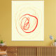 Une ligne rouge organique de différentes épaisseurs fait un chemin circulaire et concentrique sur cette toile hors-blanche.