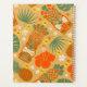 Empreinte tropicale hawaïenne avec teintes ou oranges, dorés, verts et jaunes. Impression amusante qui incorpore des têtes de totem tiki, fleurs d'hibiscus et feuilles de palmiers.