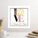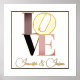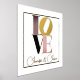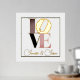 Impression de papier romantique, avec le mot LOVE fait en or, rose, noir et taupe, posé sur un arrière - plan blanc, avec un cadre doré fin autour du bord extérieur. Personnalisez le texte en or, en bas, pour lire ce que vous voulez.