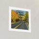 Une route bordée d'arbres colorés d'automne fixe la route divisée avec un texte motivant "Découvrez vos propres aventures". Découvrez comment ce design ressemble à toutes les tailles de carrés. Photo © Patricia AZ Phillips