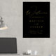 Elégant signe d'accueil de mariage avec "Welcome" dans un script de calligraphie de feuille d'or moderne avec un arrière - plan noir (ou la couleur de votre choix). Personnalisez le panneau mariage en papier noir et or en ajoutant vos noms, votre date de mariage et votre emplacement de mariage. Le panneau d'accueil vertical est conçu pour coordonner avec notre collection de mariage Modern Elegance et est disponible en d'autres couleurs.