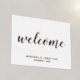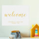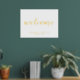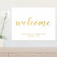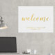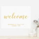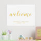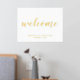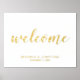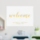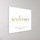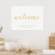 Script moderne Affiche de bienvenue Mariage blanc et or avec titre "Welcome" en véritable feuille d'or police de script moderne avec détails en or réel police sans serif moderne en or réel sur arrière - plan blanc.