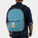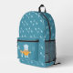 Un sac à dos bleu enfant amusant avec un ours polaire tenant une canne de pêche dans une main et un seau rempli de poissons dans l'autre. Le reste du sac a un motif d'os de poisson. Personnalisez-le avec les initiales de l'enfant. © ArianeC Illustrations-Tous droits réservés