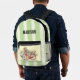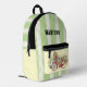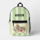 Personnalisez ce joli sac à dos avec votre nom, puis utilisez-le quotidiennement ! Elle est équipée d'un vélo rouge avec des fleurs dans le panier et d'un arrière - plan audacieux à rayures vertes et blanches.
