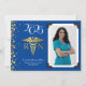 Célébrez le nouveau diplômé de l'école de sciences infirmières avec ce faire-part de diplôme en or et bleu RN caduceus! Elégant avec une bordure photo vintage et des accents de confettis dorés ! Parfait pour toute personne diplômée en tant qu'infirmière avec son baccalauréat en sciences infirmières!