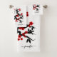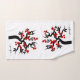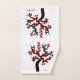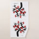 Cerisier sakura inséparables rouge et noir avec serviette de bain fleurie. Il comprend un sakura noir avec des fleurs rouges avec un coeur noir au centre et une paire d'inséparables. Votre nom est écrit dans une police de style script.