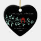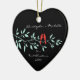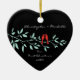 Notre premier ornement de Noël comporte une paire élégante d'inséparables rouges se reposant sur une branche et un ensemble bleus sur un arrière - plan noir ! Personnalisez avec votre information et date et vous sont tous placent pour aller ! Cadeau daté merveilleux de souvenir pour votre premier Noël et une grande addition à vous collection d'ornement de Noël.