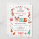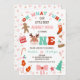 Christmas Pink Oh What Fun Reindeer 1st Birthday Invitation Multicolored retro font oh quelle amusante Noël saison première invitation pour une petite fille avec un renne qui en sort un. Cette invitation de Noël à l'anniversaire comprend également un homme de pain d'épice, des arbres de Noël, des stocks de Noël, des bonbons et plus encore. Idéal pour la fête d'anniversaire de décembre d'une petite fille.