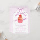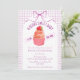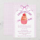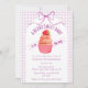 At the center of this baby shower invitation sits an adorable cupcake crowned with a sweet strawberry. A soft watercolor gingham backdrop and a delicately tied bow complete the look, creating a celebration that feels warm, whimsical, and beautifully inviting.